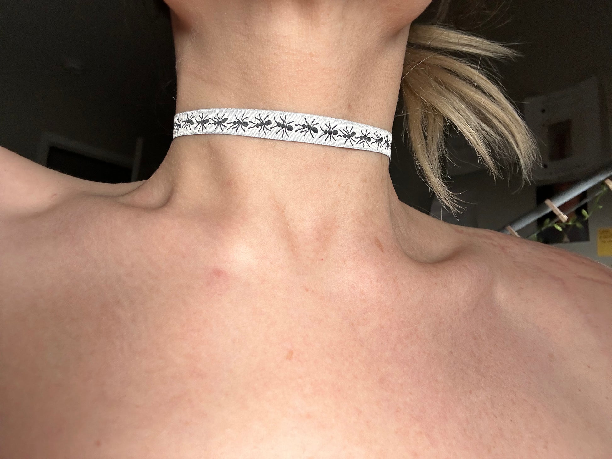 Black and white ant ribbon choker. Edges are sealed and secured in place before hardware is attached. Perfect for any insect lover <3