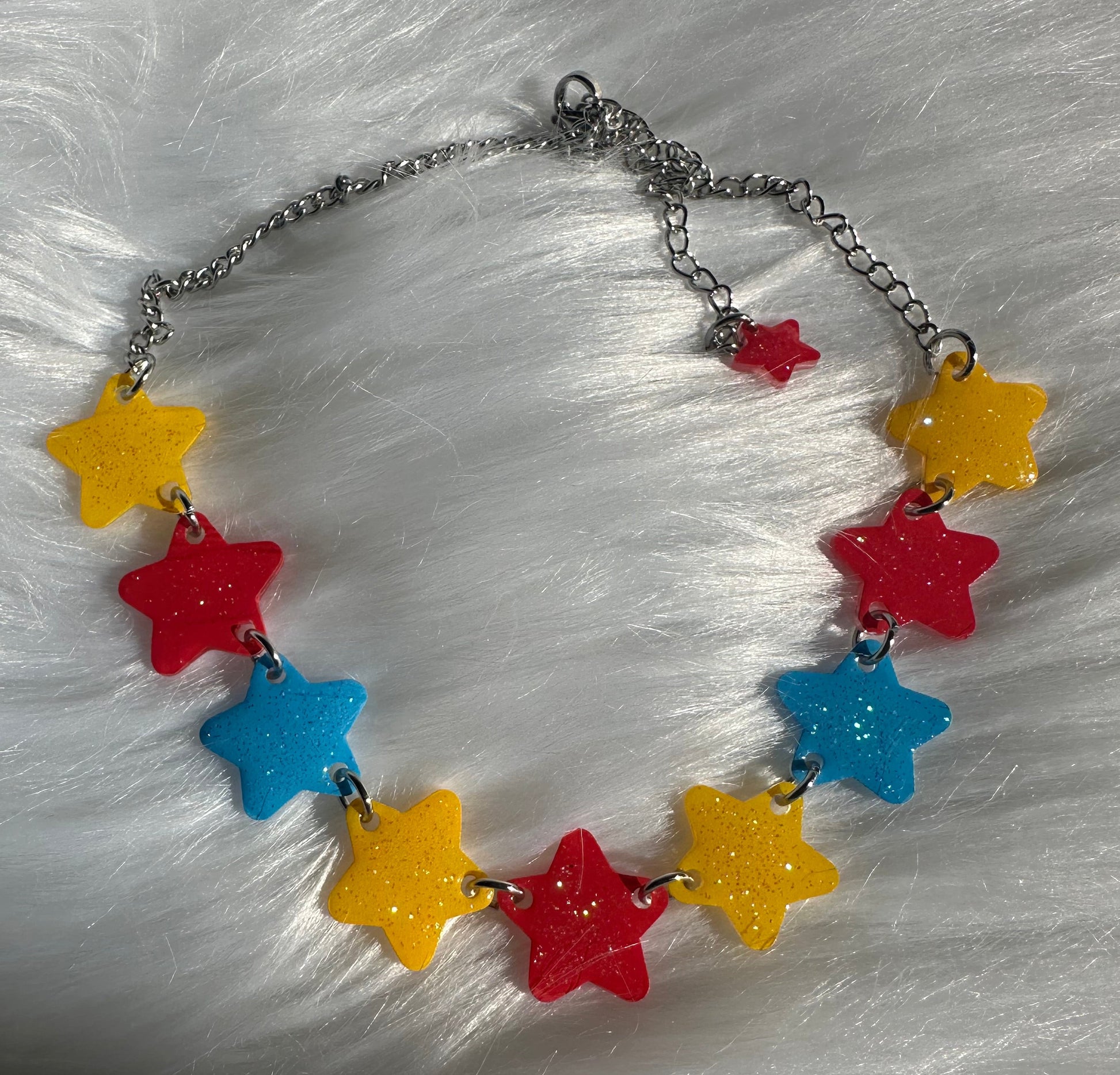 Our Clowncore Star Choker is a signature piece featuring artisan-crafted star charms (Red, Yellow, and Blue). Unlike mass-produced jewelry, every charm is individually made and assembled.
